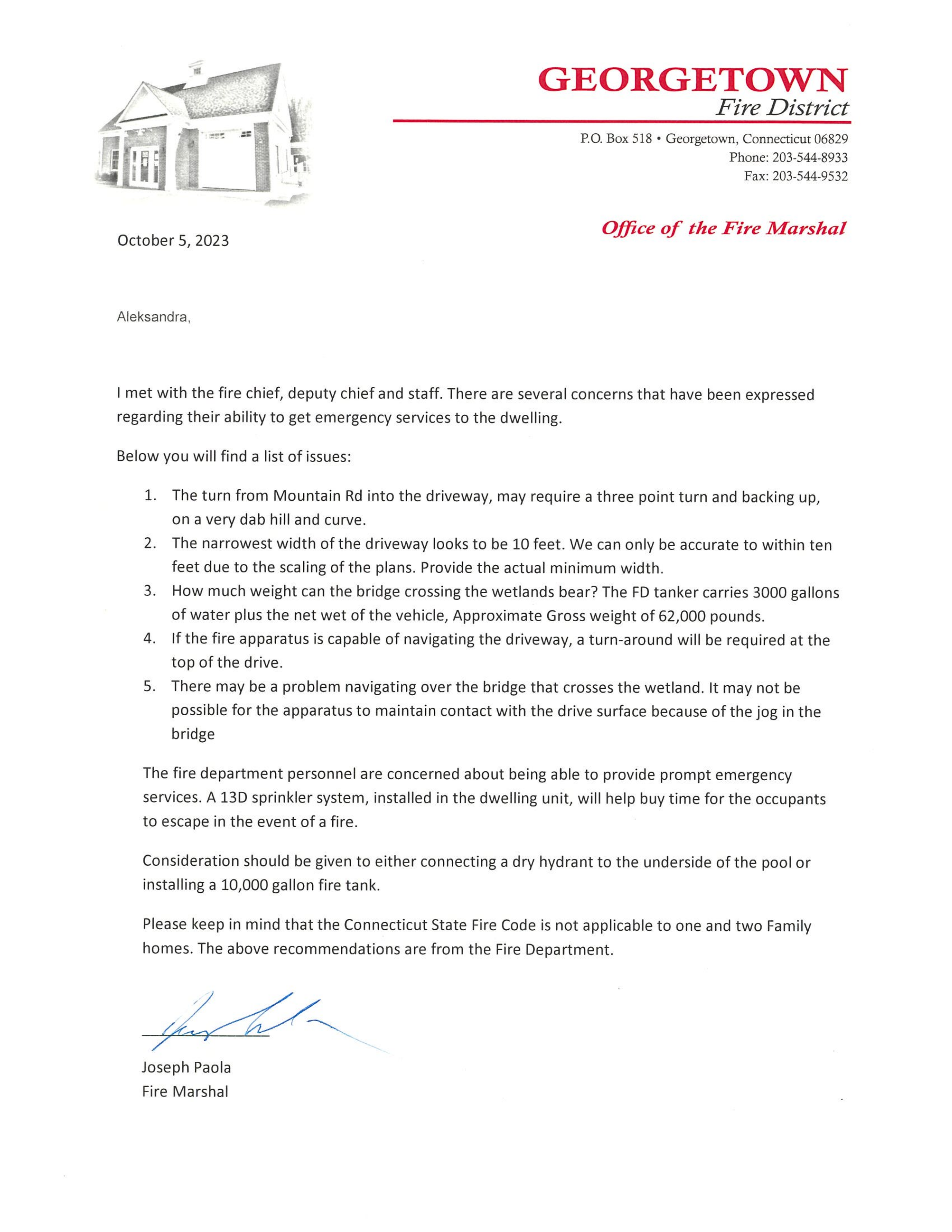 The Georgetown Fire Department has the primary jurisdiction for fire and medical emergencies for Old Driftway. The Fire Marshal has raised serious concerns regarding the length and width of Developer’s roadway, especially regarding Developer’s roadway being capable of bearing and maneuvering GFD’s fire vehicles weighing up to 62,000 pounds (31 tons). This is the FM’s opinion.